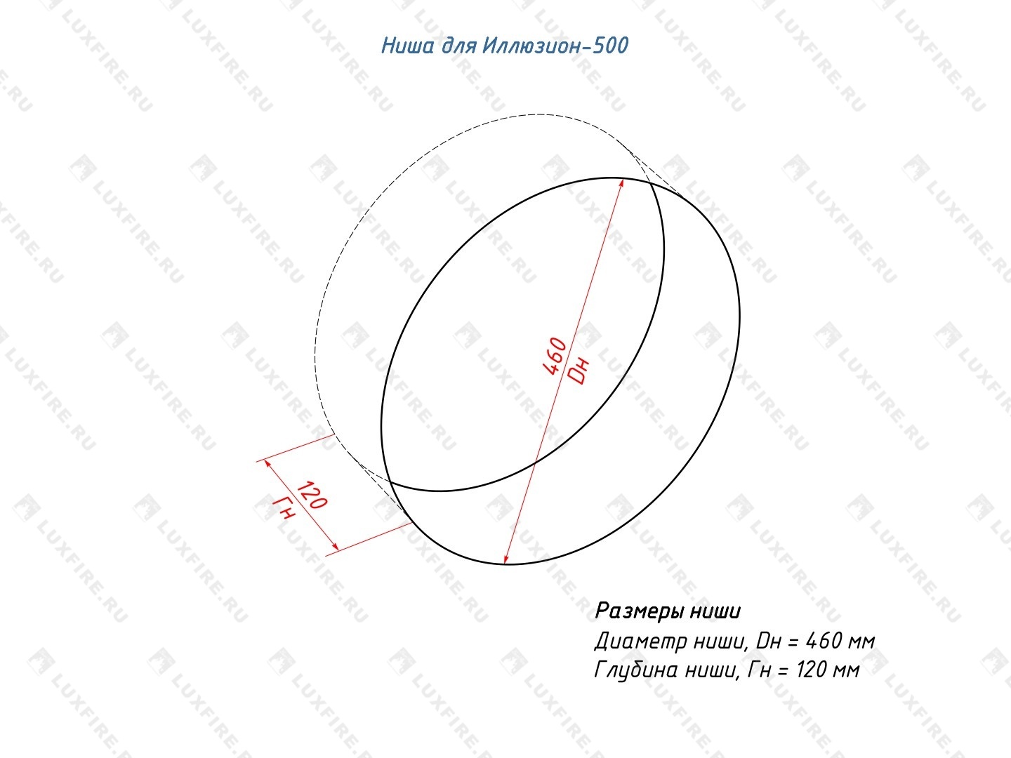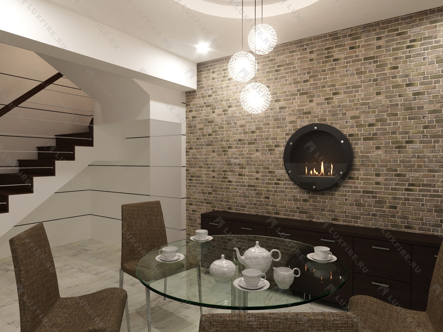 Представляет собой настенную сборную металлическую конструкцию круглой формы класса XS в виде кольца , создающую полузакрытое безопасное пространство для огня с топливным блоком Lux Fire 250 XS ограниченную закаленным стеклом в котором горит живой огонь с углом обзора 180 градусов. Универсально подходит для встройки в нишу или подвеса на стену.